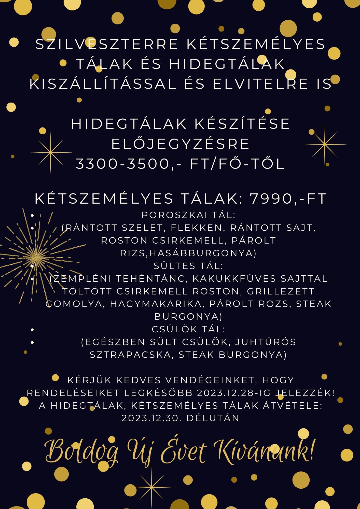 Választható saláták: Görög saláta, Orosz hússaláta, Svéd gombasaláta, Francia saláta, Burgonya saláta